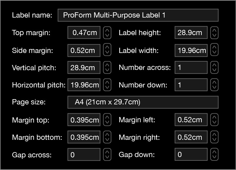 1 Label – 68845proform2024-07-01T17:20:57+00:00 Self-Adhesive Multi-Purpose Labels1 Label – Item No. 688450Label Per SheetFor Home, School and Office UseCompatible with Leading Software Packages25 Pages of Adhesive Labels 1 Label per Page – 25 Labels Includes Test Sheet Label Height: 28.9 cm Label Width: 19.96 cm Downloads for Item No. 68845DownloadsDownload Template for Microsoft WordDownload PDF Test SheetFor use with all Inkjet, Laser Printers and Copiers View Full Label Layout Settings× Share This, Choose Your Platform! FacebookXRedditLinkedInWhatsAppTelegramTumblrPinterestVkXingEmail