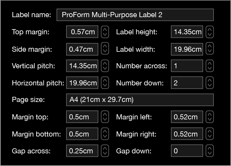 2 Labels – 59145proform2024-07-01T17:32:02+00:00 Self-Adhesive Multi-Purpose Labels2 Labels – Item No. 591450Labels Per SheetFor Home, School and Office UseCompatible with Leading Software Packages25 Pages of Adhesive Labels 2 Labels per Page – 50 Labels Includes Test SheetLabel Height: 14.35 cm Label Width: 19.96 cm Downloads for Item No. 59145DownloadsDownload Template for Microsoft WordDownload PDF Test SheetFor use with all Inkjet, Laser Printers and Copiers View Full Label Layout Settings× Share This, Choose Your Platform! FacebookXRedditLinkedInWhatsAppTelegramTumblrPinterestVkXingEmail