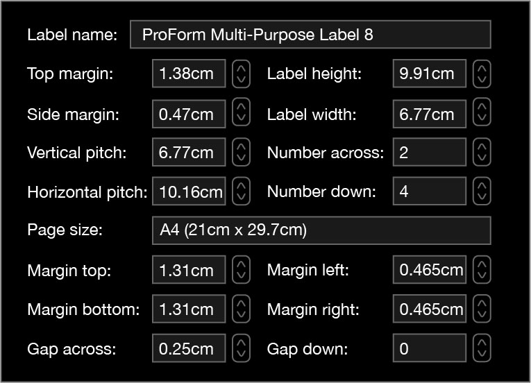 8 Labels – 59152proform2024-07-01T17:32:28+00:00 Self-Adhesive Multi-Purpose Labels8 Labels – Item No. 591520Labels Per SheetFor Home, School and Office UseCompatible with Leading Software Packages25 Pages of Adhesive Labels 8 Labels per Page – 200 Labels Includes Test SheetLabel Height: 6.77 cm Label Width: 9.90 cm Downloads for Item No. 59152DownloadsDownload Template for Microsoft WordDownload PDF Test SheetFor use with all Inkjet, Laser Printers and Copiers View Full Label Layout Settings× Share This, Choose Your Platform! FacebookXRedditLinkedInWhatsAppTelegramTumblrPinterestVkXingEmail